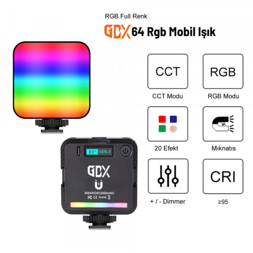 Gdx Rgb Led 60 Pocket Light; cep ledli rgb video ışığı 22 adet beyaz, 23 adet sarı, 28 adet RGB 73 adet led ile donatılmıştır. RGB modunda renkleri seçebilir ve renk sıcaklığını bir ortam ışık kaynağına uyacak şekilde 3250 ile 9000K arasında ayarlayabilir veya 20 farklı özel efekt modundan birini seçebilirsiniz.