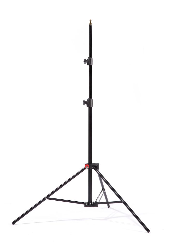 Light-weight stand with three-section air-cushioned telescope centre column. With 16 mm standard spigot and 3/8" connecting thread. 1/4" adapter included. Folds down flat.