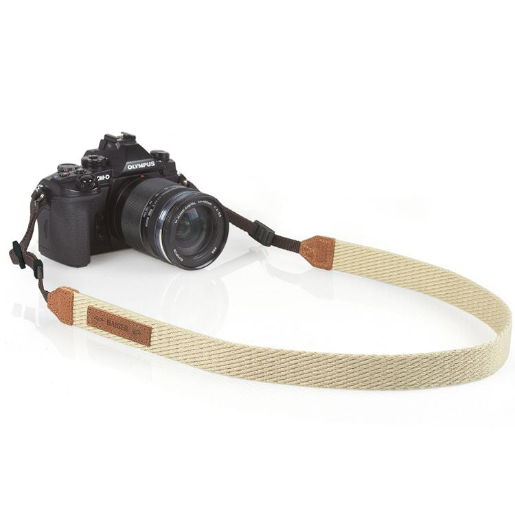 Gerçek deri uygulamaları bulunan, aşınmalara karşı son derece dayanıklı örgü, Fildişi rengi kamera askısı.