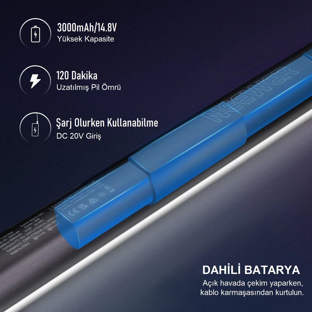 Neewer TL60RGB, 180° ışın açısı sunar ve dahili bataryası çekim sırasında şarj edilebilir.